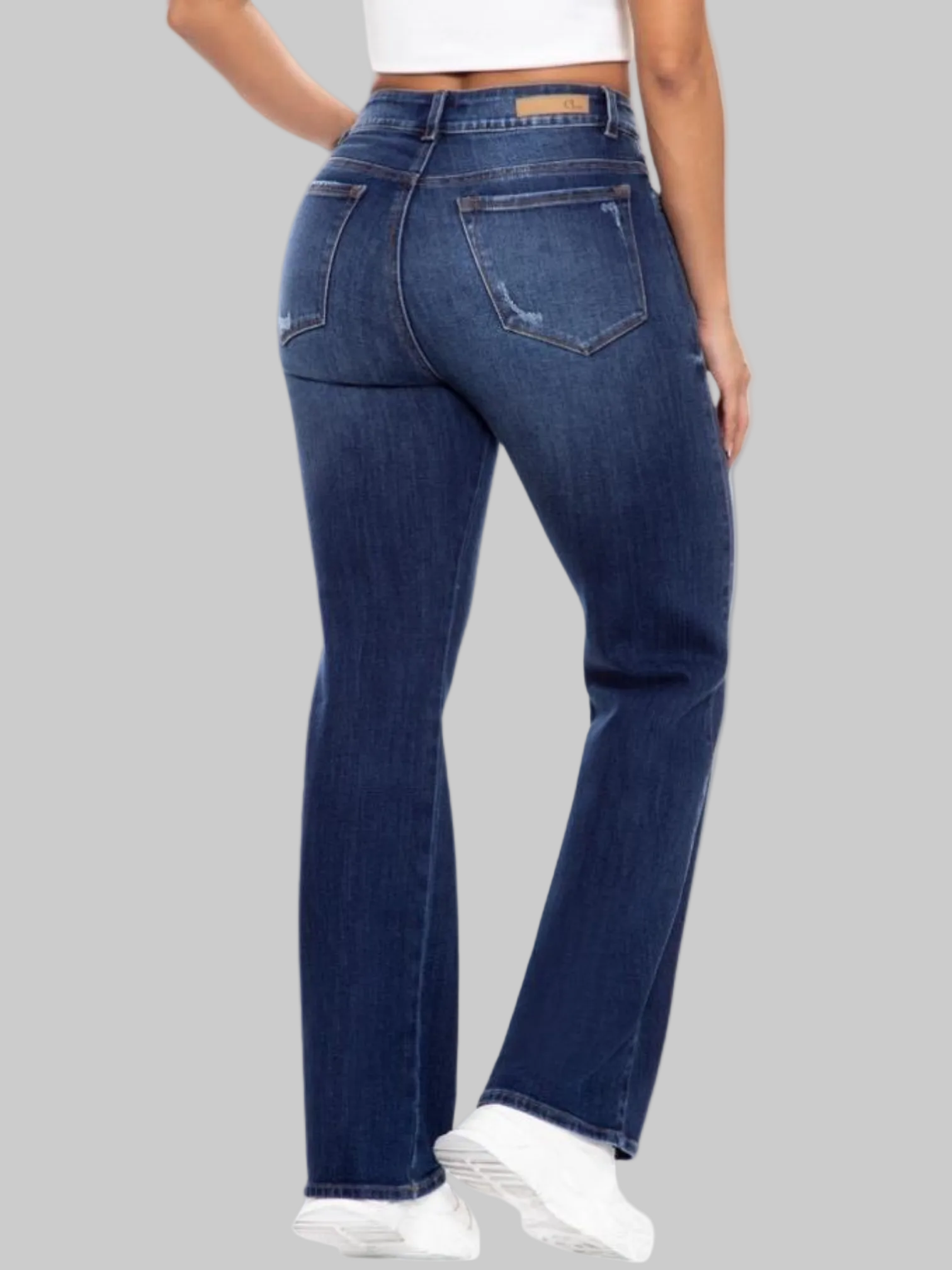 Diseñado con stretch de alto confort, se adapta al cuerpo de manera natural, realzando la cintura y afinando la silueta. Su corte recto favorece visualmente las piernas, creando un efecto largo y estilizado. Incluye sutiles desgastes frontales que aportan un toque contemporáneo sin perder la sofisticación.